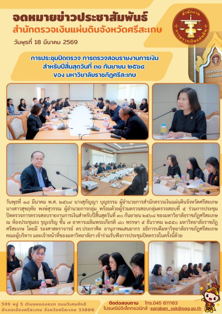 วันพุธที่ ๑๘ มีนาคม พ.ศ. ๒๕๖๙ นางสุกัญญา บุญธรรม ผู้อำนวยการสำนักตรวจเงินแผ่นดินจังหวัดศรีสะเกษ นางสาวสุขฤทัย พงษ์สุวรรณ ผู้อำนวยการกลุ่ม พร้อมด้วยผู้ร่วมตรวจสอบกลุ่มตรวจสอบที่ ๕ ร่วมการประชุมปิดตรวจการตรวจสอบรายงานการเงินสำหรับปีสิ้นสุดวันที่ ๓๐ กันยายน ๒๕๖๘ ของมหาวิยาลัยราชภัฏศรีสะเกษ ณ ห้องประชุมธง รุญเจริญ ชั้น ๗ อาคารเฉลิมพระเกียรติ ๘๐ พรรษา ๕ ธันวาคม ๒๕๕๐ มหาวิทยาลัยราชภัฏศรีสะเกษ โดยมี รองศาสตราจารย์ ดร.ประกาศิต อานุภาพแสนยากร อธิการบดีมหาวิทยาลัยราชภัฏศรีสะเกษ คณะผู้บริหาร และเจ้าหน้าที่ของมหาวิทยาลัยฯ เข้าร่วมรับฟังการประชุมปิดตรวจในครั้งนี้ด้วย